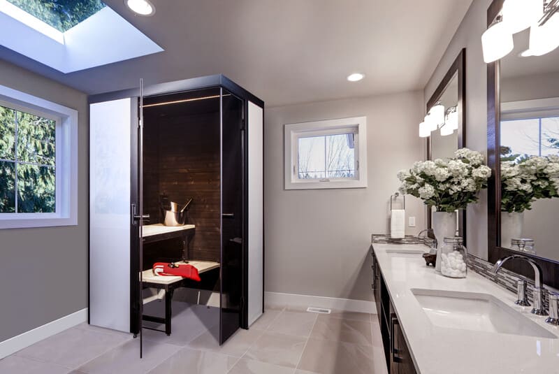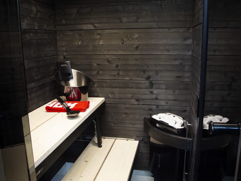 - Laadukkaat kotimaiset materiaalit yhdessä tyylikkäiden tummanharmaiden lasiovien kanssa viimeistelevät saunan ulkonäön