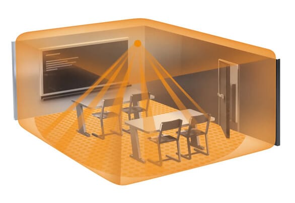 Luotettava tunnistus infrapuna- ja ultraäänitunnistuksen yhdistelmällä. Läsnäolotunnistusalue 28 m² (asennuskorkeus enintään 3,5 m), kattoasennus. Saatavana COM1, COM2, DALI-2 IPD ja KNX.