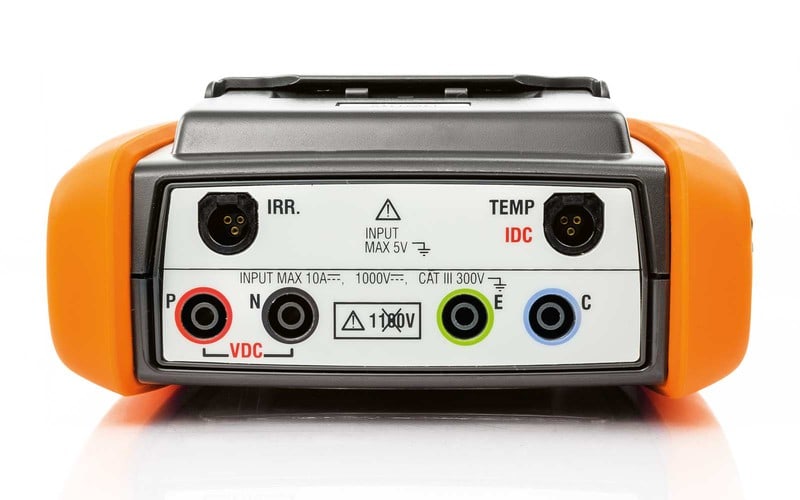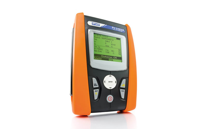 Aurinkosähköasennusten tarkastukseen. MittalaiteMonitoimilaite aurinkosähköjärjestelmien käyttöönottotarkistuksiin. PVCHECKs mahdollistaa turvallisen, helpon ja nopean käyttöönottotarkistuksen aurinkosähköjärjestelmien tasavirtapuolelle. Laite on suunniteltu vastaamaan standardin IEC/EN62446 vaatimuksia ja sillä voidaan suorittaa koko käyttöönottotarkistus yhdellä mittauskytkennällä. Mittalaitteeseen syötetään mitattavien paneelien tiedot ja laite laskee niiden perusteella standardiolosuhteita vastaavat tulokset automaattisesti.PVCHECKs mittalaitteen IVCK mittaustoiminnolla voidaan suorittaa samanaikaisesti seuraavat mittaukset: - Jatkuvuuden mittaus (200 mA)- Eristysresistanssin mittaus (max 1000 V)- Oikosulkuvirran mittaus (max 15 A)- Avoimenpiirin jännite (max 1000 V)- NapaisuusKaikki mittalaitteesta löytyvät mittaustoiminnot voidaan suorittaa myös erikseen. Laite tallentaa mittaustulokset sisäiseen muistiin, josta ne voidaan siirtää PC:lle raportointia varten. Mittaustulokset ovat helposti luettavassa muodossa ja ne voidaan liittää semmoisenaan mittauspöytäkirjan liitteeksi. Tällöin käyttöönottotarkistuksen suorittaminen käy nopeasti ja turvallisesti. Mitta-alue: 1000 V DC / 15 A Luokka: CAT III 300 V IP luokka: IP40Mitat (mm): 235x165x75Virtalähde: 6x 1.5 V AA alkaliparistoPaino (mukaan lukien paristot): 1.2 kgToimitussisältö:- Topview2006 ohjelmisto- HT4004 virtapihti 10/100 A- Borsa2051 laukku- KITGSC4 4 kaapelia + 4 banaanikosketinta + 4 alligaattorileukaa- KITPCMC3- KITPCMC4