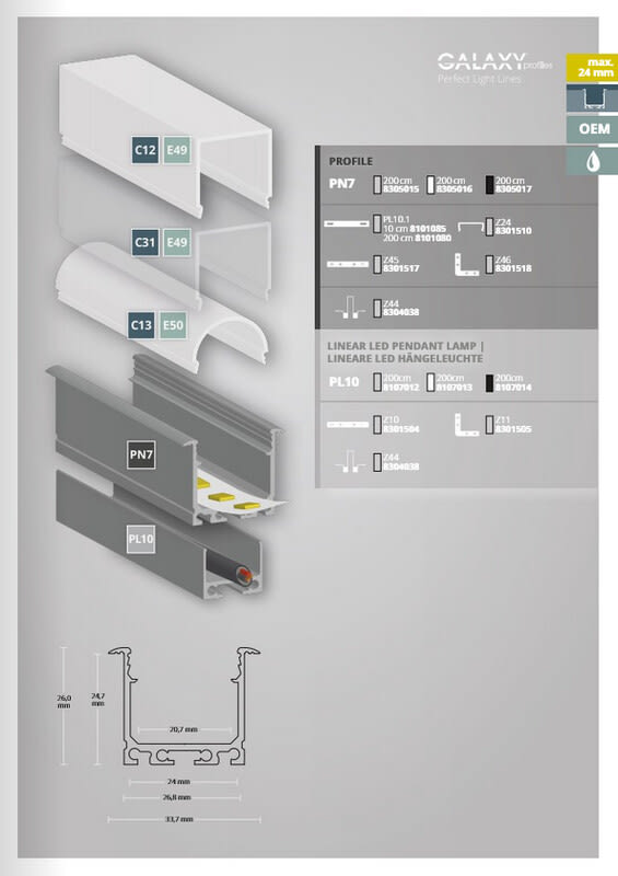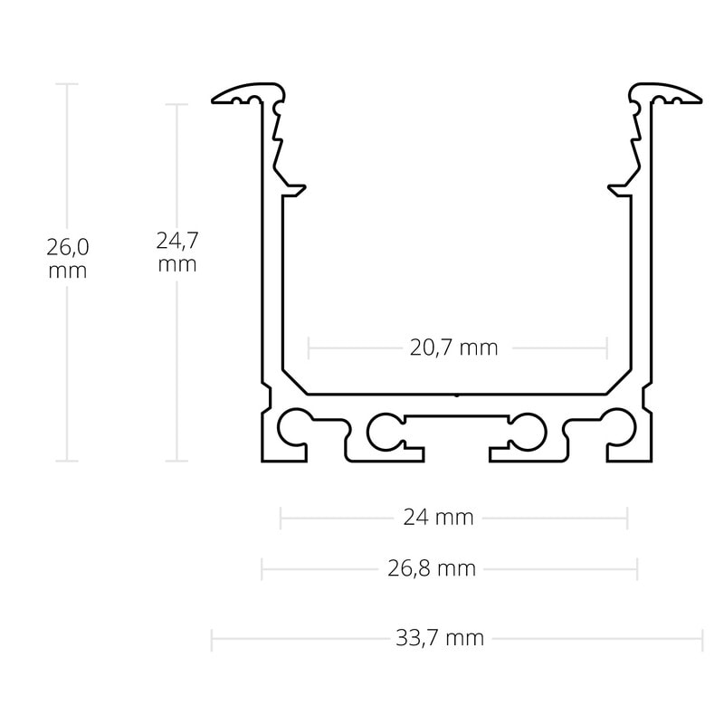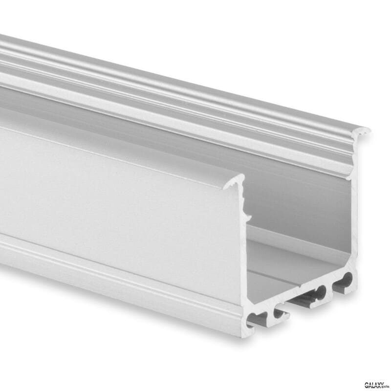 PN7N LED uppoasennusprofiili, alumiini eloksoitu, pituus 200 cm. LED-nauha max. 24 mm. Galaxy®-profiles profiilivalikoima on tarkoitettu LED-nauhoille, joissa on kiinnitysteippi valmiina. Tyylikkäät profiilit toimivat hyvänä lämmönjohtimena LED-nauhalle ja edesauttavat nauhan pitkää ikää. Mallisto kattaa laajan valikoiman erilaisia profiileja pinta- ja uppoasennukseen sekä kaikki tarvittavat lisätarvikkeet. Värivaihtoehdot ovat eloksoitu, valkoinen tai musta. Suojakansi parantaa valaistusominaisuuksia ja toimii samalla mekaanisena suojana avoimille LED-nauhoille. Profiilit soveltuvat sisä- ja ulkokäyttöön. Mallistosta löytyy myös LED-nauhojen jäähdytysprofiilit.