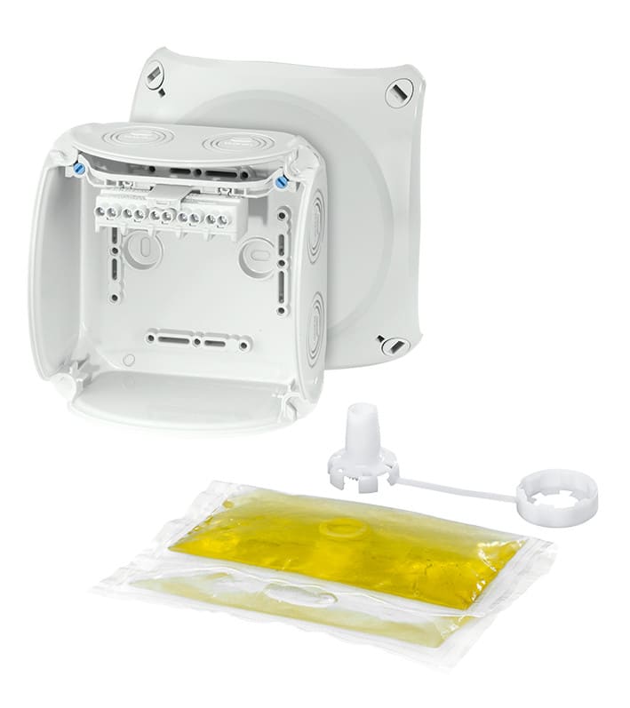Geelijatkos jako– ja liitäntärasioihin nopeasti kiinteytyvällä elastisella geelillä estäen veden pääsyn ja kondenssiveden muodostumisen koteloon kokonaan. Geelillä on erinomaiset eristysominaisuudet. Koska geeli on läpinäkyvä, on aina mahdollista tehdä aistinvarainen tarkastus. Läpinäkyvä elastinen geeli on itsestään sulkeutuva, joten piirin mittaus on mahdollista tehdä ja geeli tiivistyy uudelleen. Geeli on helposti poistettavissa muutostöitä varten. Muita etuja: luotettava suoja sähköiskua vastaan ja tärinän kestävä. Geeli ei toimi vedonpoistona, vaan tarrautuu kiinni. Vedonpoistoksi tulee käyttää sopivia ASM- tai ASS-holkkitiivisteitä.