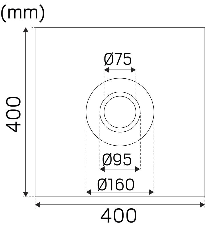 TAUSTALEVY 400X400. PEHMEÄLLE ALAKATOLLE. LÄPIVIENTI KOLMELLE ERI REIKÄKOOLLE. 75-95-160MM. HEHKULANKATESTATTU 650 astC