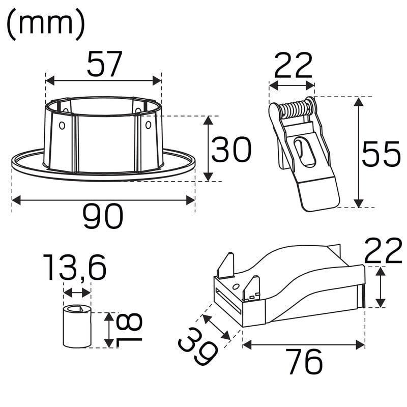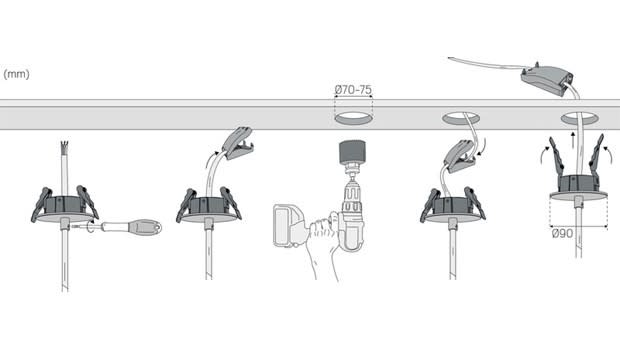 Focus Pendant Micro -valaisimen kaltaisten riippuvalaisinten ripustus-/kiinnitystarvikkeet. Soveltuu upotettavaksi tavallisesti reikiin asennusjousilla. Saatavana on myös versio, joka sopii asennettavaksi pinta-asennuksena kattoon tai kattorasiaan / kattorasian päälle ruuveilla.