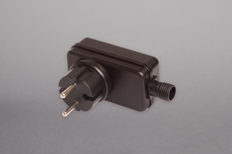 Plug-in-muuntaja IP44, 12W 12V DC tuotteille Decklight Garden ja Spotlight Garden, helppo ja nopea kytkentä ruuviliittimellä. Täydennetään jatkokaapelilla Garden.