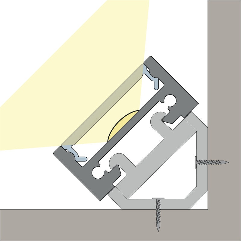 Matala profiili, useita käyttökohteita. Suoran kuvun kanssa siisti valaisin sulautuu myös tilaltaan rajattuun paikkaan. Huurretun ja korkean kuvun kanssa saadaan tasaista ”ympärisäteilevää valoa” kuten T5-valaisimista. Magneettikiinnike metallipintaan asennusta varten. Katso yleistaulukko sopivien LEDstrip-valaisinten välilehdestä.