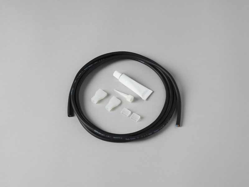 Liitäntäsarja LEDstrip 24V IP67 Line Sarja, joka sopii LEDstrip 24V IP67 -nauhalle. Sisältää 2 päätypalaa, 2 kaapeliliitäntää, 2 metrin kaapelin sekä 10 ml silikonituubin tiivistämistä varten.