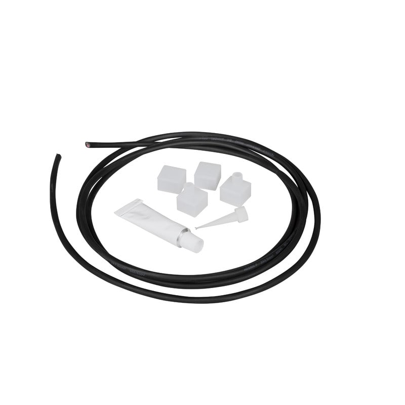 LEDstrip Neon Mini IP67 -liitäntäsarja. Sisältää 2 päätetulppaa ja 2 kaapelien päätyliitäntää, 2 metriä (mustaa) kumipintaista kaapelia ja 10 ml:n silikoniputkilon.