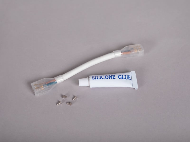 LEDstrip 230V -jatkosarja kahden 230V LEDstrip -nauhan yhdistämiseksi toisiinsa esimerkiksi kulman ympäri. Sisältää 10cm kumipintaista kaapelia, ruuviliitännät molemmissa päissä, 2 päätyliitäntää ja yhden 10 ml:n silikoniputkilon molempien päätyjen tiivistämiseen.