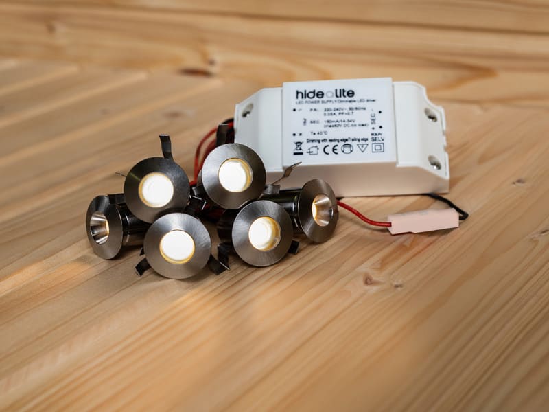 Täydellinen sarja, jonka avulla on helppo asentaa huomaamattomia ja tunnelmallisia pieniä valopisteitä saunan valaistukseksi. Harjatusta teräksestä valmistetut valaisimet, joissa on mukautettu valon virtaus häikäisyn estämiseksi. Valaisimissa on kaksi kaapelia sekä pikaliitäntä kätevää sarjakytkentää varten. Sarjassa on 6 valaisinta, joissa on vaihehimmennettävä ohjain, jatkokaapeli ja liitäntäjohdot. Saatavana myös yksittäisvalaisimena. Ohjaimella voidaan käyttää ja himmentää 5-12 valaisinta. Mustat ja messinkiset valaisinkehykset saatavana tarvikkeina.