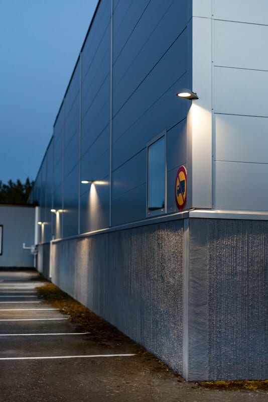 Sharp Wall on terävästi muotoiltu täydellinen julkisivuvalaisin suurten kiinteistöjen seinälle asennettavaksi. Valaisin täyttää häikäisyä, tasaisuutta ja värintoistoa koskevat vaatimukset pysäköinnissä. Sopii täydellisesti teollisuuslaitoksen julkisivuun, kiinteistön autotallirivistöön tai vaikkapa varaston porttiin. Säädettävä valomäärä. Värilämpötila voidaan valita DIP-kytkimellä suoraan valaisimessa. Iskunkestävä (IK10) ja kestävä jauhemaalaus pohjoismaisen ilmaston haasteisiin Säädettävä kallistuvalla valaisinpäällä, joten valoa voidaan suunnata 0-30°. Kulmakiinnike tarvikkeena sekä kiinnityslevy ohuille pelti- ja kevytbetonijulkisivuille. Helppo asennus erillisellä taustakappaleella ja ketjutettavalla pikaliittimellä, suora 230V liitäntä. Sopii pinta-asennettavalle kaapelille