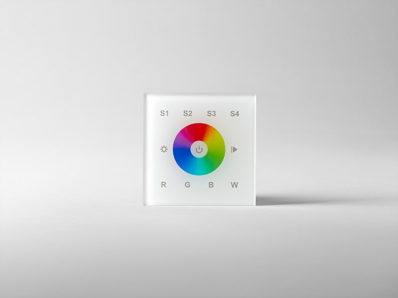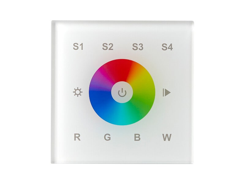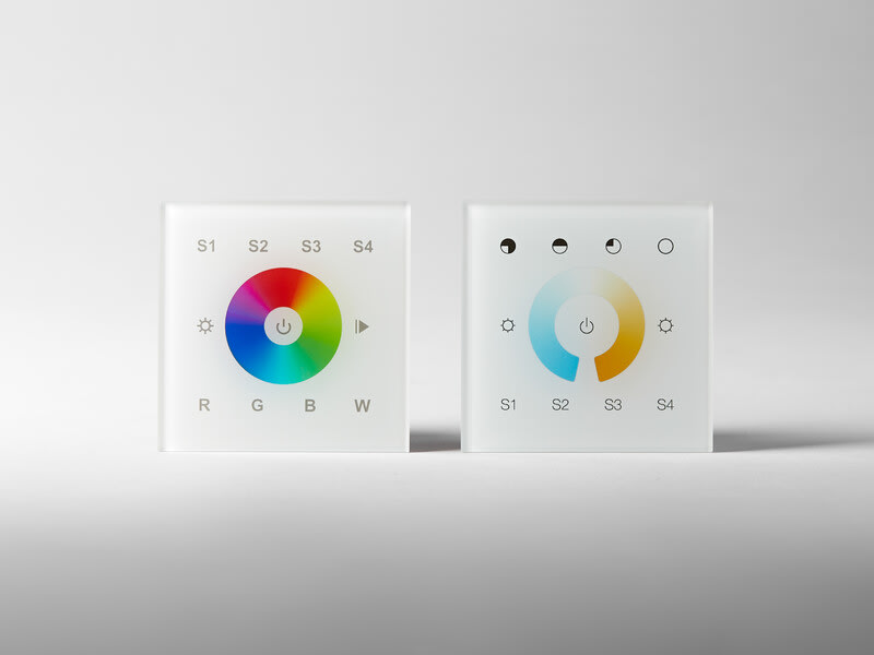 Käyttämällä RGB ja RGBW LED-nauhojamme sekä Touchpanel RGBW:tä voit helposti muuttaa väriä ja valovoimaa muutamalla painalluksella. Ohjaa yhteensopivia liitäntälaitteita DALI Broadcastin tai osoitteen määrittämisen avulla. Tallennettavissa neljä erilaista skenaariota. Helppo asennus kojerasiaan seinässä. Kytke kätevästi jopa neljä paneelia valaistuksen ohjaamiseksi useista paikoista käsin.