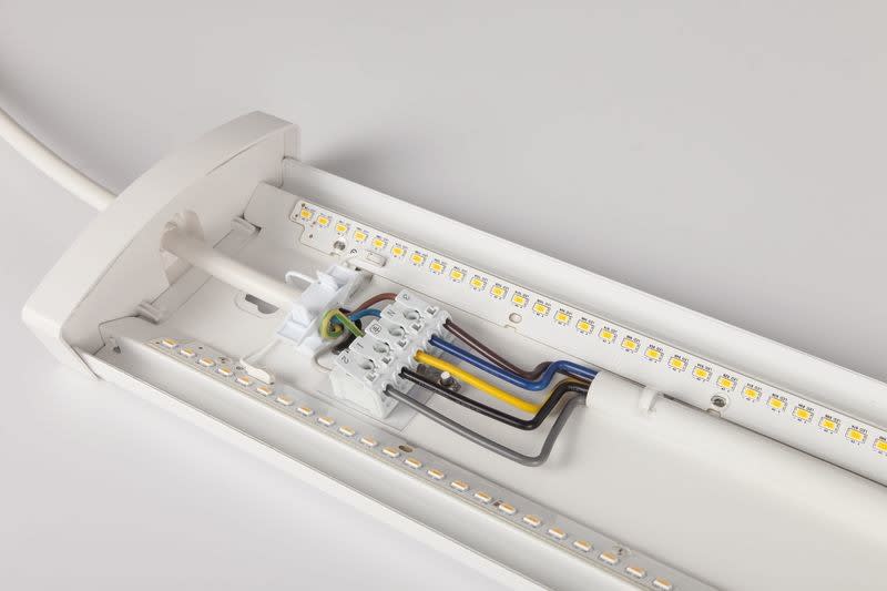 IP44-valaisin suurella valomäärällä ja erittäin hyvällä tehokkuudella. Tässä 2xT mallissa on ketjutusmahdollisuus pikaliittimillä molemmissa päädyissä. On/OFF -versio. Maalatusta teräslevystä tehty valaisin. Harkittu muotoilu patentoiduilla taittuvilla päädyillä helpottaa asennusta. Prismamainen akryylikupu opaalikalvolla antaa tasaisen valon jakauman. 5-napainen pikaliitin ketjutusta varten, läpivienti molemmissa päädyissä sekä kaksi keskellä, toinen keskitetty. Valon määrälle kaksi asetusta 4600lm tai 6050lm.