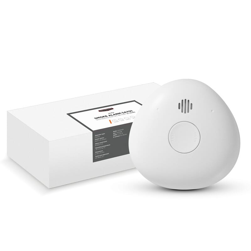 - Palovaroittimen sisäänrakennettu litiumparisto kestää koko 10 vuoden käyttöiän ajan – ylimääräinen turvatekijä, joka varmistaa, ettei pariston vaihtamisesta tarvitse kantaa huolta.