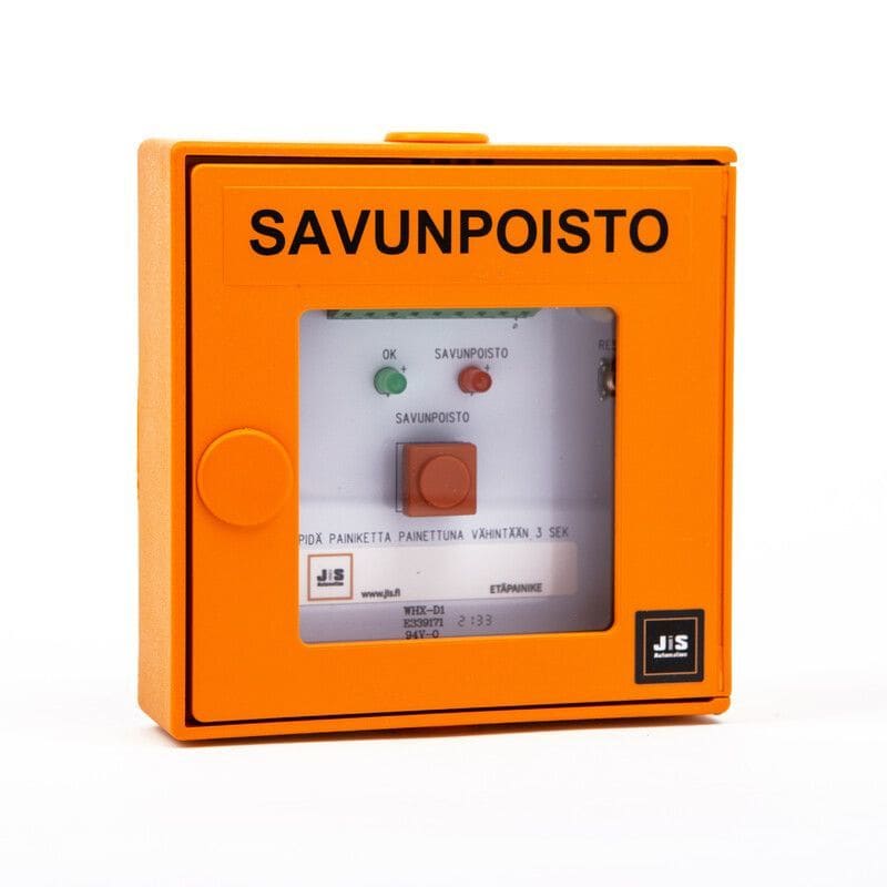 3S5-01XX-sarjan savunpoistokeskuksen Etäpainike, led indikoinnilla. Oranssi laukaisupainike. Painikkeessa on teksti ”SAVUNPOISTO”. IP20 Painikkeessa on kytkimet laukaisun resetoinnille, sekä tuuletusohjaukset. \"auki\" ja \"kiinni\"