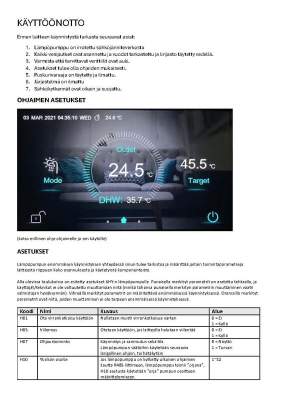 - Veden lähtölämpötilat -7C⁰ 70C⁰, -20C⁰ 65C⁰ ja -25C⁰ 60C⁰