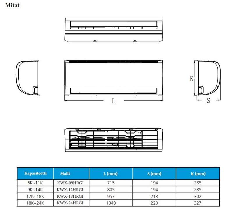- Sisäyksikön mitat 957x302x213mm