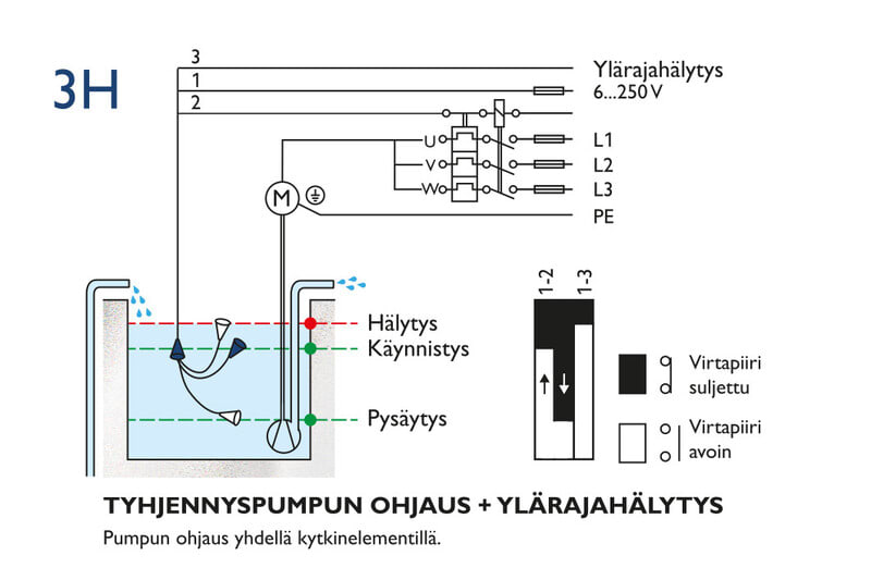 Tyhjennyspumpun ohjaus + ylärajahälytys. 5 m PVC-kaapeli