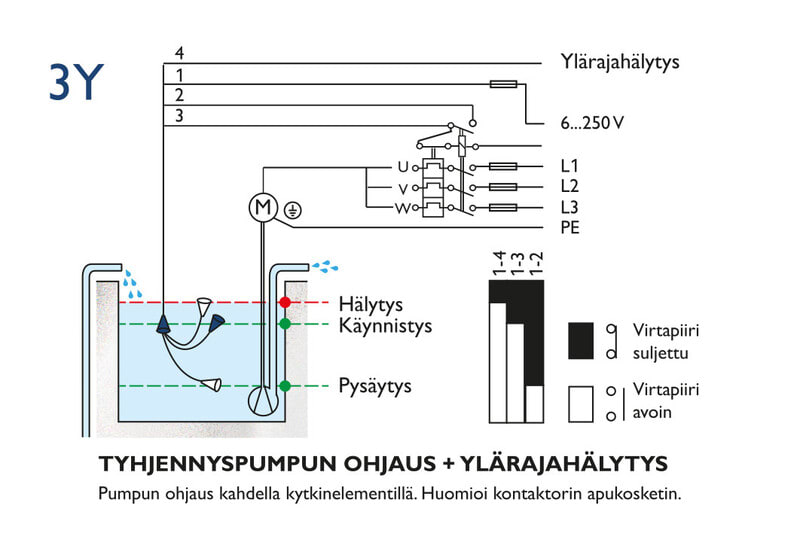 Tyhjennyspumpun ohjaus + ylärajahälytys. 5 m PVC-kaapeli