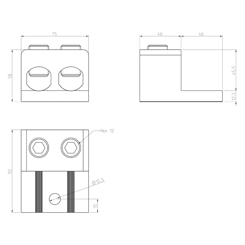 Kojeliitin (Al/Cu) Alumiini ja kupari (Al/Cu) kaapeleiden liitin kaapeleille: Al 95 - 300mm Cu 95 - 300mm Kiristys kuusiokolo avain: HEX 12Vääntömomentti: 45 (95 - 120mm) 75 (150 - 300mm)