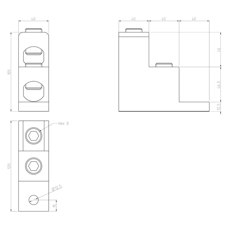 Kojeliitin (Al/Cu) Alumiini ja kupari (Al/Cu) Lapa alhaalla kaapeleiden liitin kaapeleille: Al 95 - 300mm Cu 95 - 300mm Kiristys kuusiokolo avain: HEX 12 Vääntömomentti: 45 (95-120 mm2) / 75 (150-300 mm2)