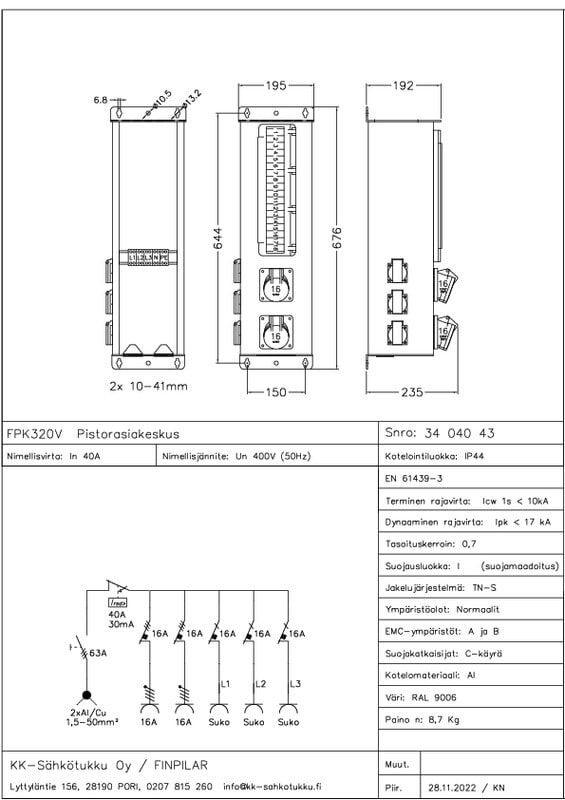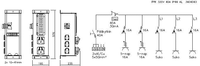 KK-SÄHKÖTUKKU - p.rasiat 3xsch+2 kpl 16A/5-na - FPK 320V PISTORASIAKESKUS