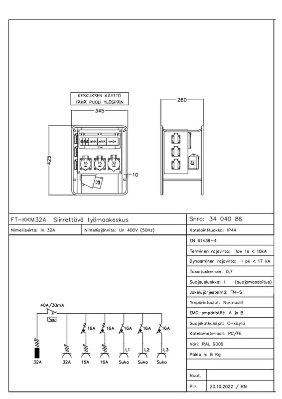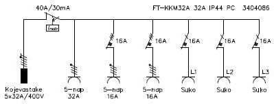 KTAKR 32A2 Työmaan alakeskus3S+216A/400V+1x32A/400V+3xjs1n16A/C+2xjs16/C+VVn40A/30mA+kojev32A/400V
