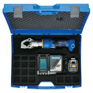 Sähköhydraulinen tuurnapuristustyökalu 60kN puristusvoimalla, MAKITA akulla, laturilla ja säilytyslaukulla. Sisäänrakennettu puristuspaineen valvonta. Erillinen sovellus dokumenttien hallintaan ladattavissa.