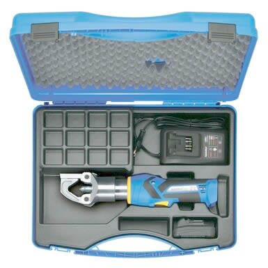 Sähköhydraulinen tuurnapuristustyökalu 30kN puristusvoimalla, 10,8V/1,5Ah akulla, muovisessa kuljetuslaukussa. Sisäänrakennettu puristuspaineen valvonta.