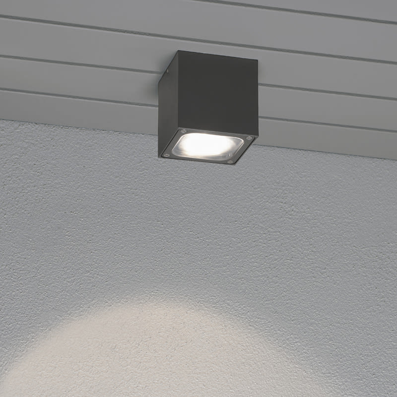 Kattovalaisin, harmaa, korkeus 10 cm, kirkas lasi, IP54, 400lm, LED 6W kiinteä valonlähde, 3000K, maalattu alumiini.
