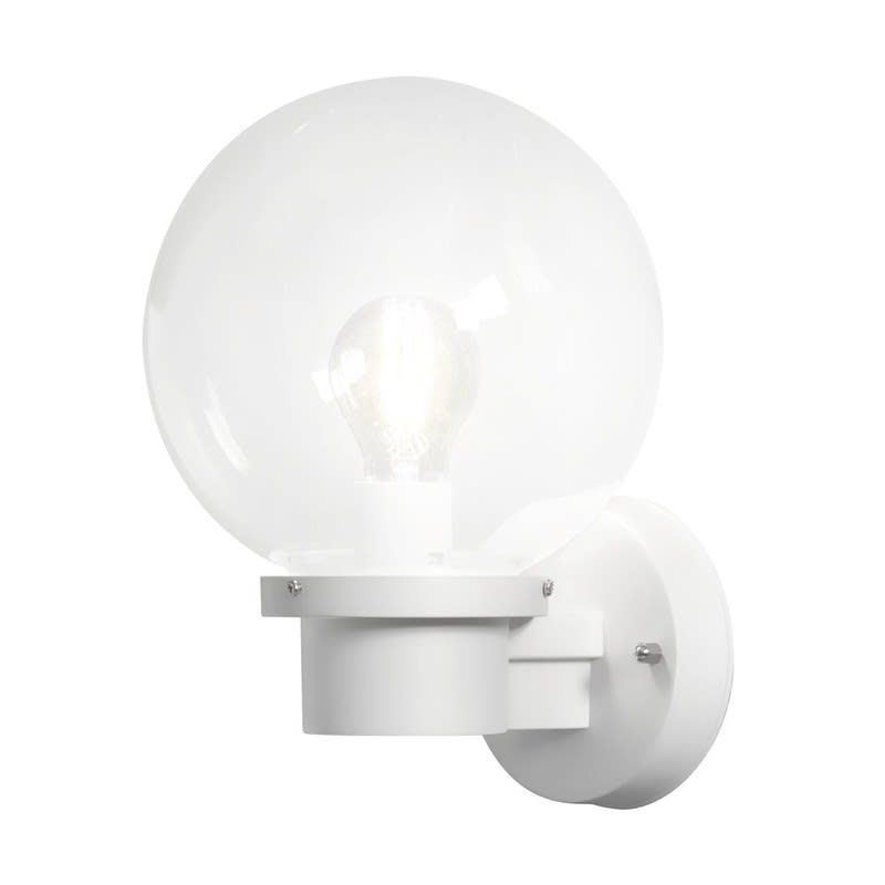 Seinävalaisin, valkoinen, kirkas lasi, muovirunko, korkeus 29 cm, IP44, E27 ei sis. pakettiin, polttimon max korkeus 160 mm.