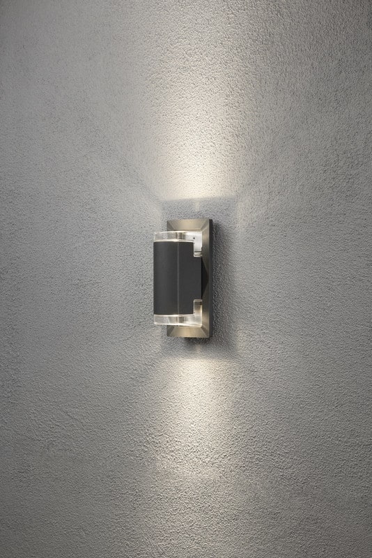 Seinävalaisin, antrasiitinharmaa, akryyliraidat, korkeus 22,5 cm, ylös-alasvalo, IP54, 2xGU10 valonlähde ei sis. pakettiin, polttimon max korkeus 70 mm.