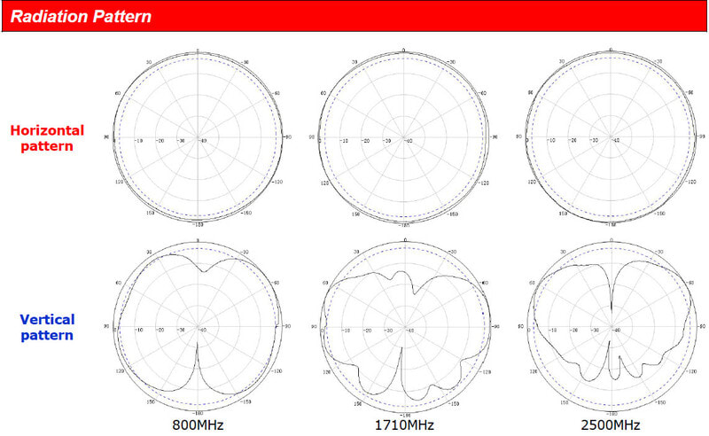 Ympärisäteilevä ja pystypolarisaatiolla (Vertical) oleva kattoon asennettava Low PIM antenni. Taajuusalue 380-3800 MHz. Toimii VIRVE ja mobiilitaajuus verkoissa. Vahvistus 380-520MHz: 2.0 dBi ja 698-960 MHz: 2.5 dBi, 1710-2700 MHz: 5 dBi ja 3300-3800MHz: 5 dBi. Antenni varustettu 2 metrin kaapelilla jossa 4.3-10-naarasliitin. Impedanssi 50 ohmia, tehonkesto 50W, Low PIM antenni -153dBc@2*43dBm. Sisäkäyttöön.