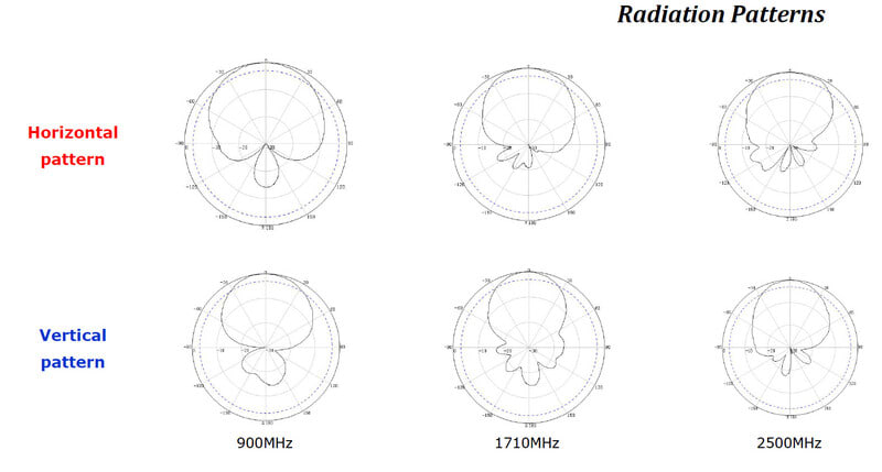 - VSWR: 380-520 MHz: <2.5, 698-960 MHz < 2.0, 1710-2700 MHz: <2.0, 3300-3800 MHz: <2.0