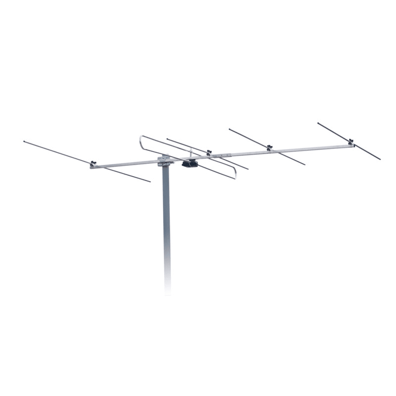 5-elementtinen FM-alueen antenni F-liittimellä, mastoille Ø38-50mm,etu-/takasuhde 18-24dB, avauskulma H/V=50°/70°, Tuulikuorma 120km/h=55,9N