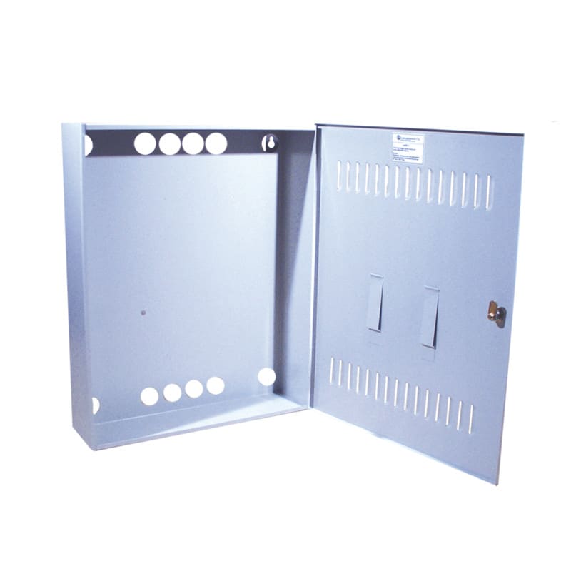 LAPK 1 vahvistinkaappi, pinta-asennus, maalattu valkoinen teräs, lukollinen (Abloy), mitat 480×600×140/115mm l×k×s×hs, valmiit kaapelin läpivientireiät.