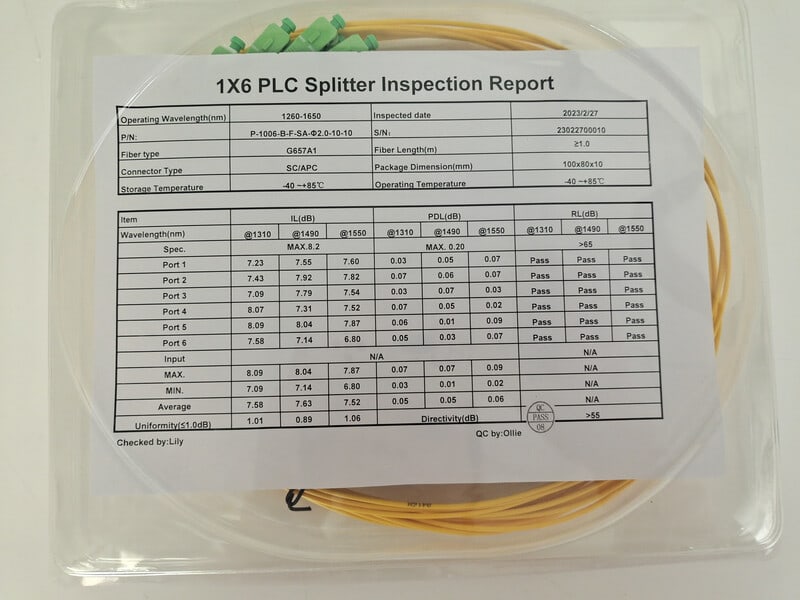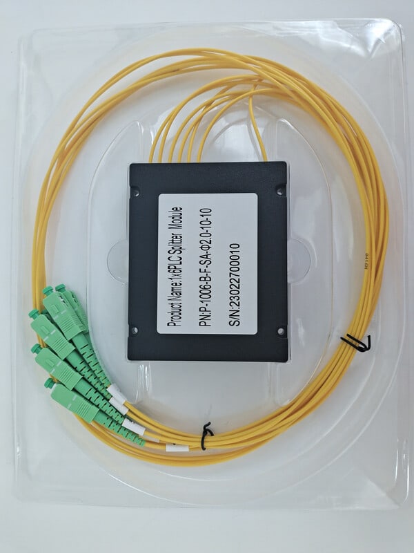 Yksimuoto (SM) optinen jaotin kuuteen, 1m pituisilla Ø 2mm paksuisillaG657A kytkentäkuiduilla joissa valmiina SC/APC liittimet. Aallonpituudet1310/1550 nm, vaimennus 9,0 dB.