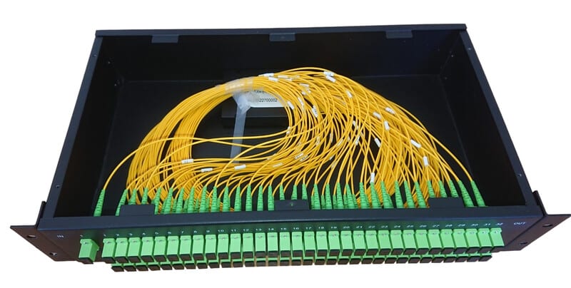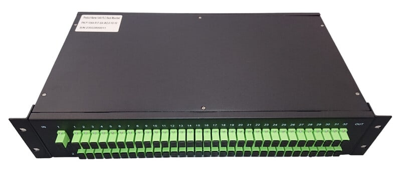 Yksimuoto (SM) 19” paneelissa (2U) oleva optinen jaotin kuuteenkymmeneen neljään SC/APC liittimillä. Aallonpituudet 1310/1550 nm, vaimennus 20,4 dB.