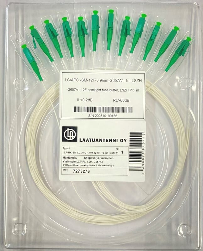 Läpinäkyvässä blisterpakkauksessa 12 kpl valkoisia yksimuoto (SM) häntäkuituja LC/APC, 9/125um, 0.9mm, G657A1, pituus 1.0m, semitight-tube buffer, LSZH ulkovaipalla.