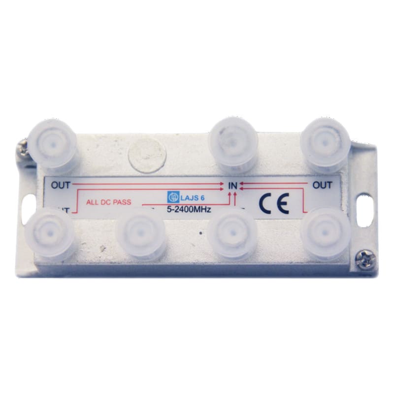 LAJS 6, jaotin kuuteen 5-2400 MHz. (5-40MHz=11.2dB, 40-1000MHz=12.5dB,1000-2050MHz=16.5dB, 2050-2400MHz=17.5dB). Jännitteen läpisyöttökaikista lähdöistä (OUT) > tuloliittimeen (IN), diodikytketty. Max. 30VDC / 1A.