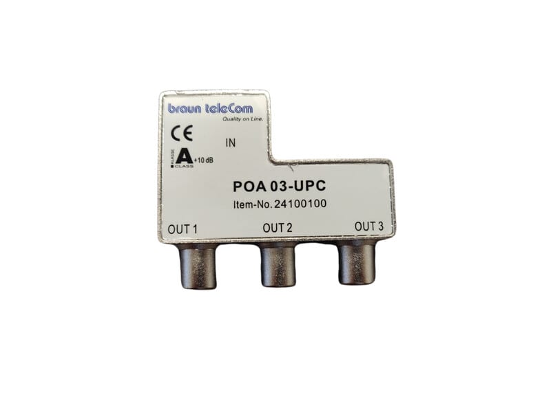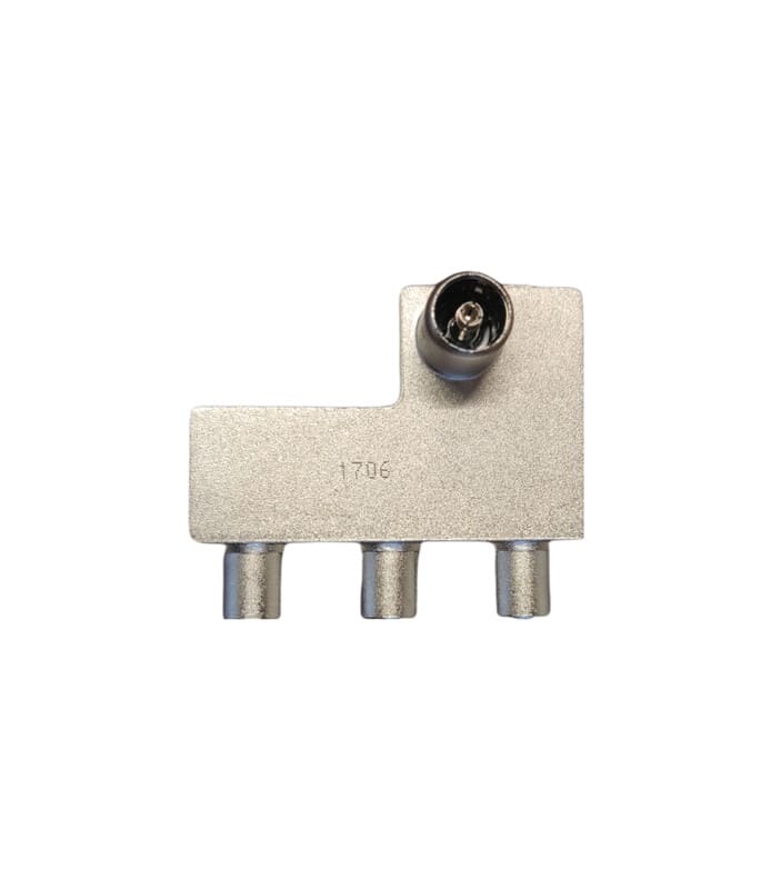 Antennirasiaan TV-liittimeen painamalla kytkettävä jaotin kolmeen,jakovaimennus 6dB, yksi sisääntulo (IEC-naaras) ja kolme lähtöä (IEC-koiras), 5-2000MHz
