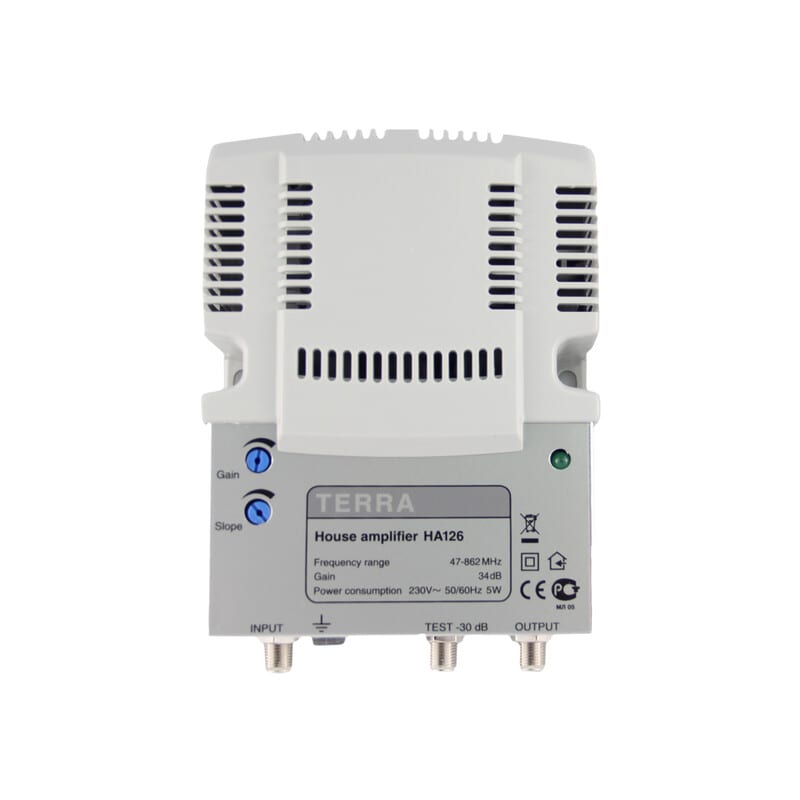 HA 126 Pientalonlinjavahvistin, 47-862MHz, säädettävä Gmax=34dB, tilt,117dBuV (DIN45004B), 101dBuV (CTB, EN 50083-3), 1×OUT, 1×mittapiste-30dB, 1-tulo.