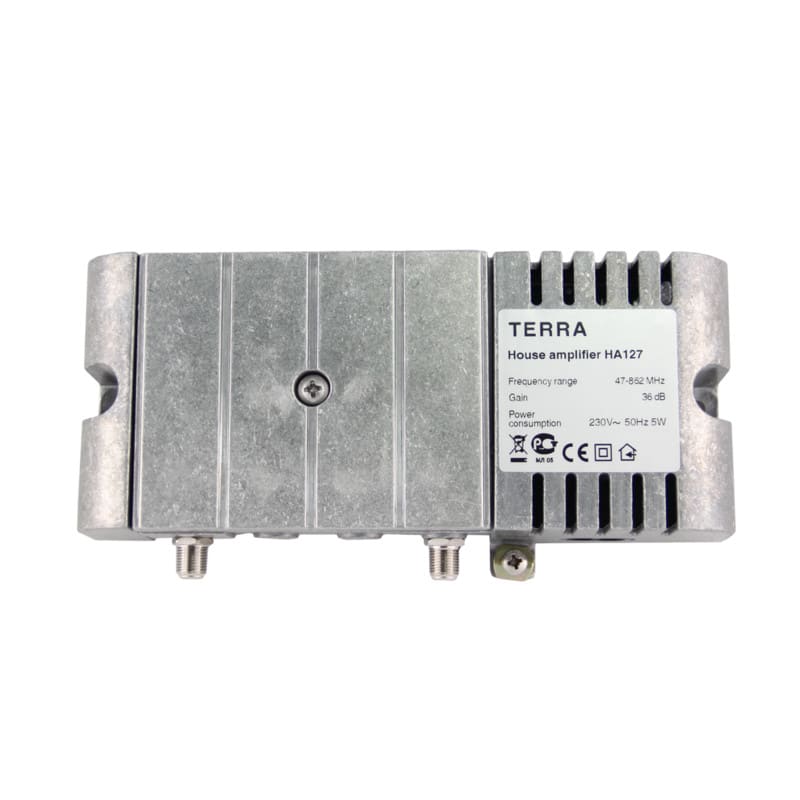 HA 127 Talovahvistin, 47-862MHz, säädettävä Gmax=36dB, max.vahvistus valittavissa 27/36dB, 101dBuV (CTB, EN 50083-3), 1-tulo.