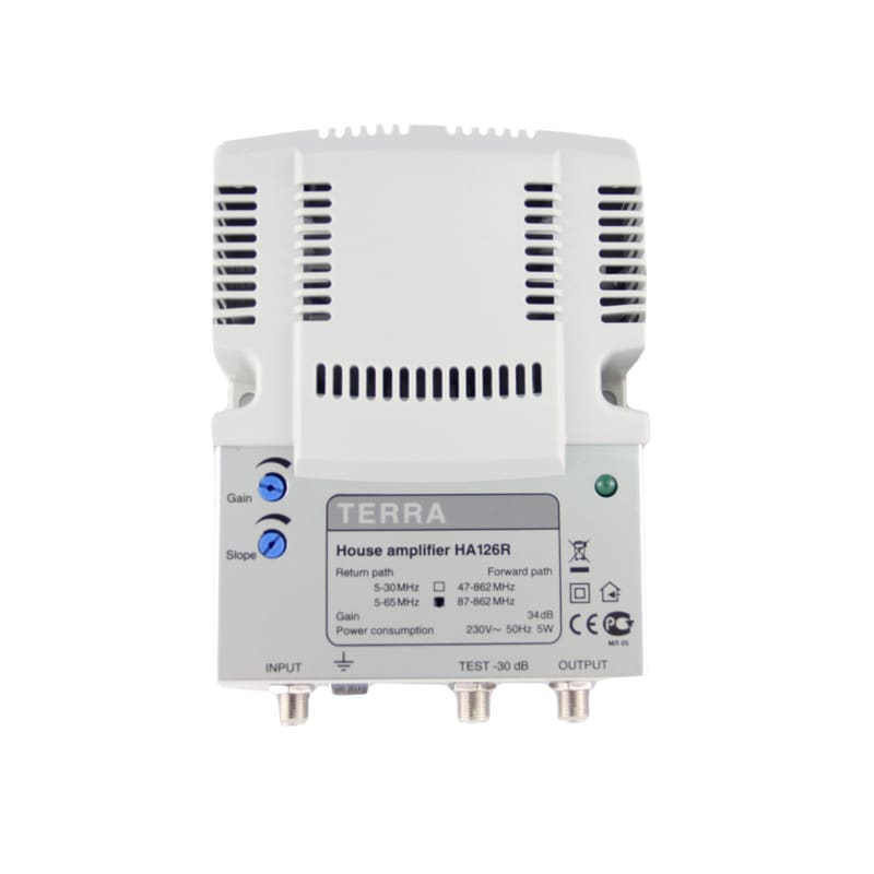 KTV-talovahvistin, 87-862MHz, säädettävä vahvistus Gmax=36dB. Max.vahvistus valittavissa 27/36dB. Lähtötaso 101dBuV (CTB, EN 50083-3). Paluusuunta 5-65MHz G=24dB (aktiivinen) / -3dB (passiivinen), 1-tulo.