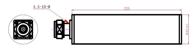 Päätevastus / Keinokuorma 50 ohmia, tehonkesto 25 W, 350-3800 MHz,4.3-10 urosliitin. Low PIM tuote -153dBc@2x43dBm. Sisä- ja ulkokäyttöönIP65.