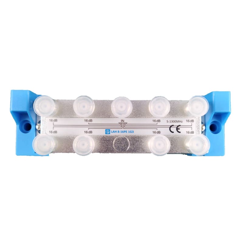 16dB päättyvä haaroitin kahdeksaan sekä valmiiksi kiinnitetyteristinkappaleet, 5-1300MHz (Docsis 3.1), heijastusvaimennuslaatuluokka1 (Grade 1), SA luokka A. Kaikki F-liittimet päällä samaan suuntaan.Maadoitusruuvin alle sopii 6 mm2.