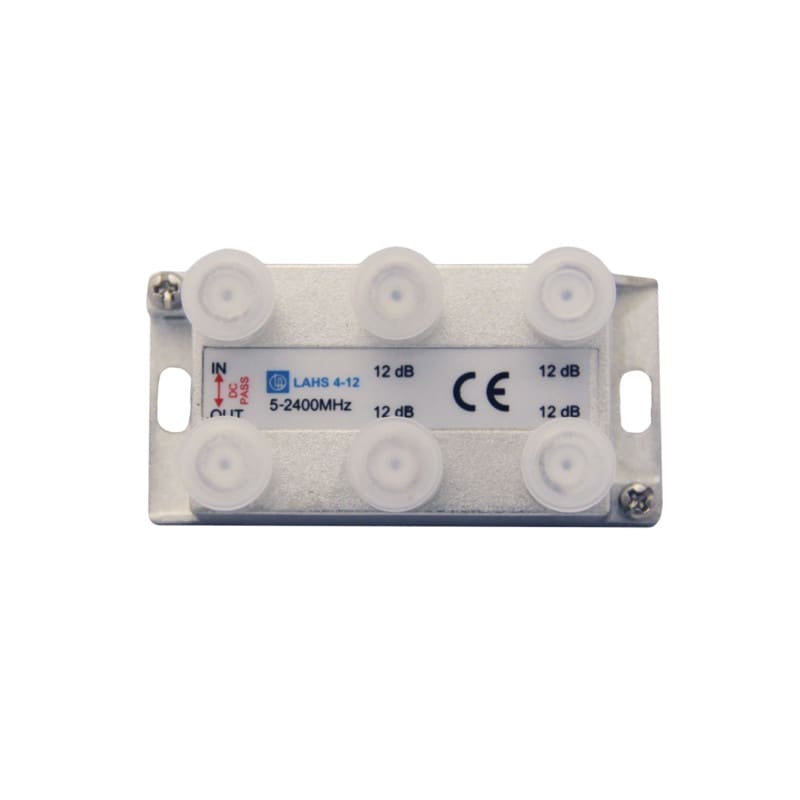 LAHS 4-12, haaroitin neljään, läpimenevä, 5-2400 MHz, 12dB. Jännitteenläpisyöttö IN <> OUT liittimien välillä, 2-suuntainen (kela).Max.30 VDC / 1A. Ei jännitesyöttöä haaroihin.