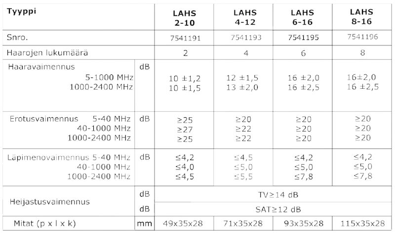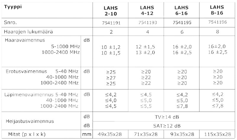 LAHS 4-12, haaroitin neljään, läpimenevä, 5-2400 MHz, 12dB. Jännitteen läpisyöttö IN OUT liittimien välillä, 2-suuntainen (kela). Max. 30 VDC / 1A. Ei jännitesyöttöä haaroihin.