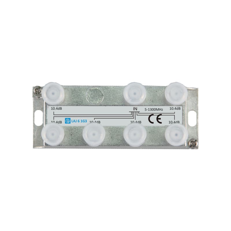 LAJ 6 1G3 jaotin kuuteen kuuluu Laatuantenni Oy:n 1G3 jaotin sarjaan joka kattaa taajuusalueen 5-1300 MHz (Docsis 3.1), sen heijastusvaimennus laatuluokka on 1 (Grade 1) sekä SA luokka on A. Jaotin on valmistettu pieneen sinkkivalurunkoon jossa kaikki F-liittimet ovat päällä saman suuntaisesti. Maadoitusruuvin alle sopii 6 mm2 kaapeli.