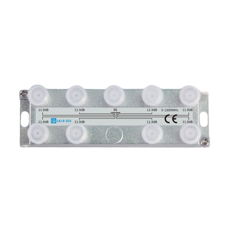 LAJ 8 1G3 jaotin kahdeksaan kuuluu Laatuantenni Oy:n 1G3 jaotin sarjaan joka kattaa taajuusalueen 5-1300 MHz (Docsis 3.1), sen heijastusvaimennus laatuluokka on 1 (Grade 1) sekä SA luokka on A. Jaotin on valmistettu pieneen sinkkivalurunkoon jossa kaikki F-liittimet ovat päällä saman suuntaisesti. Maadoitusruuvin alle sopii 6 mm2 kaapeli.