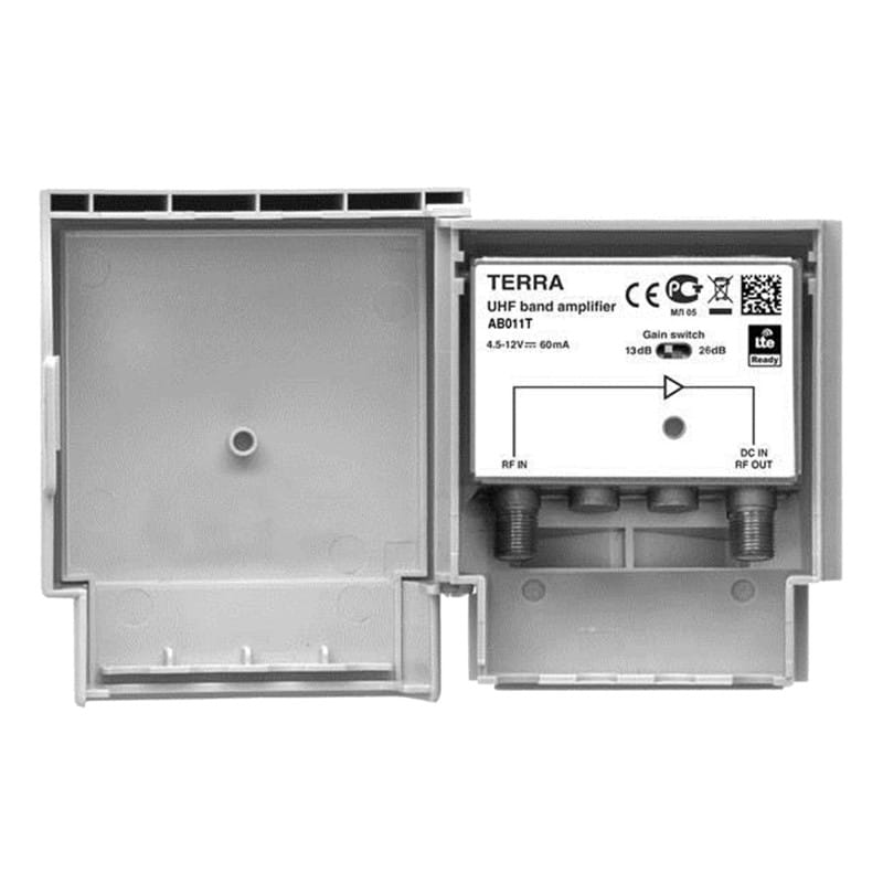 LTE700-Ready, UHF (470-694MHz), vahvistus 13/26dB valittavissakytkimellä. Estovaimennus 703MHz -10dB UHF-alueen vahvistuksesta. Lähtötaso IMD3=60dB 105dBuV. Kohina 1.3dB (700MHz). Käyttöjännite +4.5-12V / 60 mA.